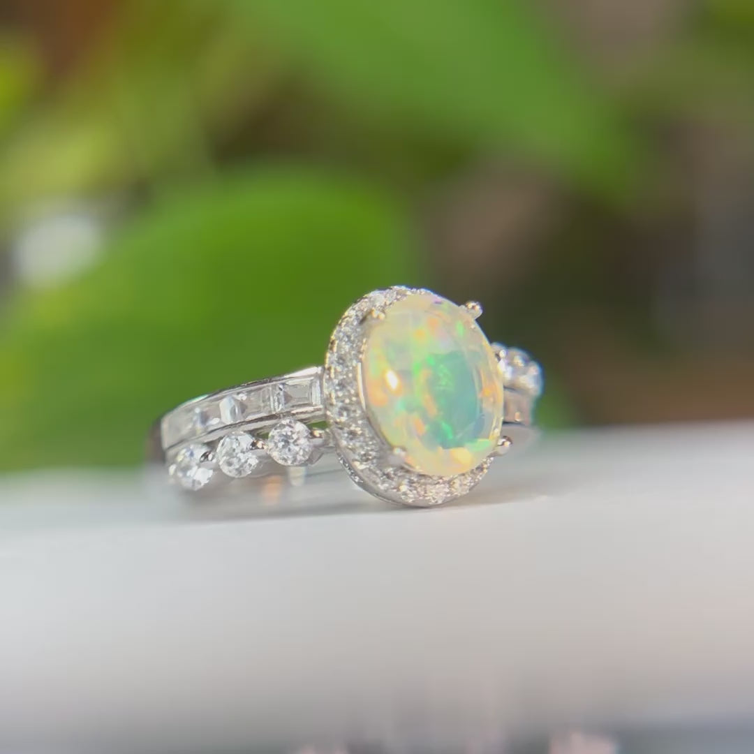 Mystical and luminous, Lunar Veil features a 6x8mm cabochon-cut opal that shimmers with soft, shifting hues—like moonlight filtered through a veil of clouds. The iridescent center is encircled by a halo of cubic zirconia, enhancing the stone’s ethereal glow with a delicate brilliance.