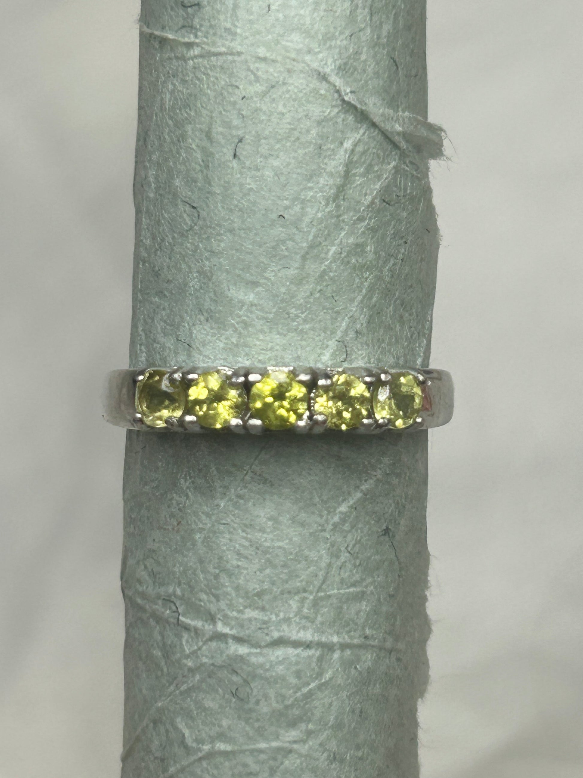 Clean, radiant, and quietly distinctive—this band ring features four 3mm round-cut natural chrysoberyl stones, aligned in a graceful row. Known for their unique inner glow and subtle chatoyancy, these golden-green gems shimmer like drops of sunlight along a line of silver.