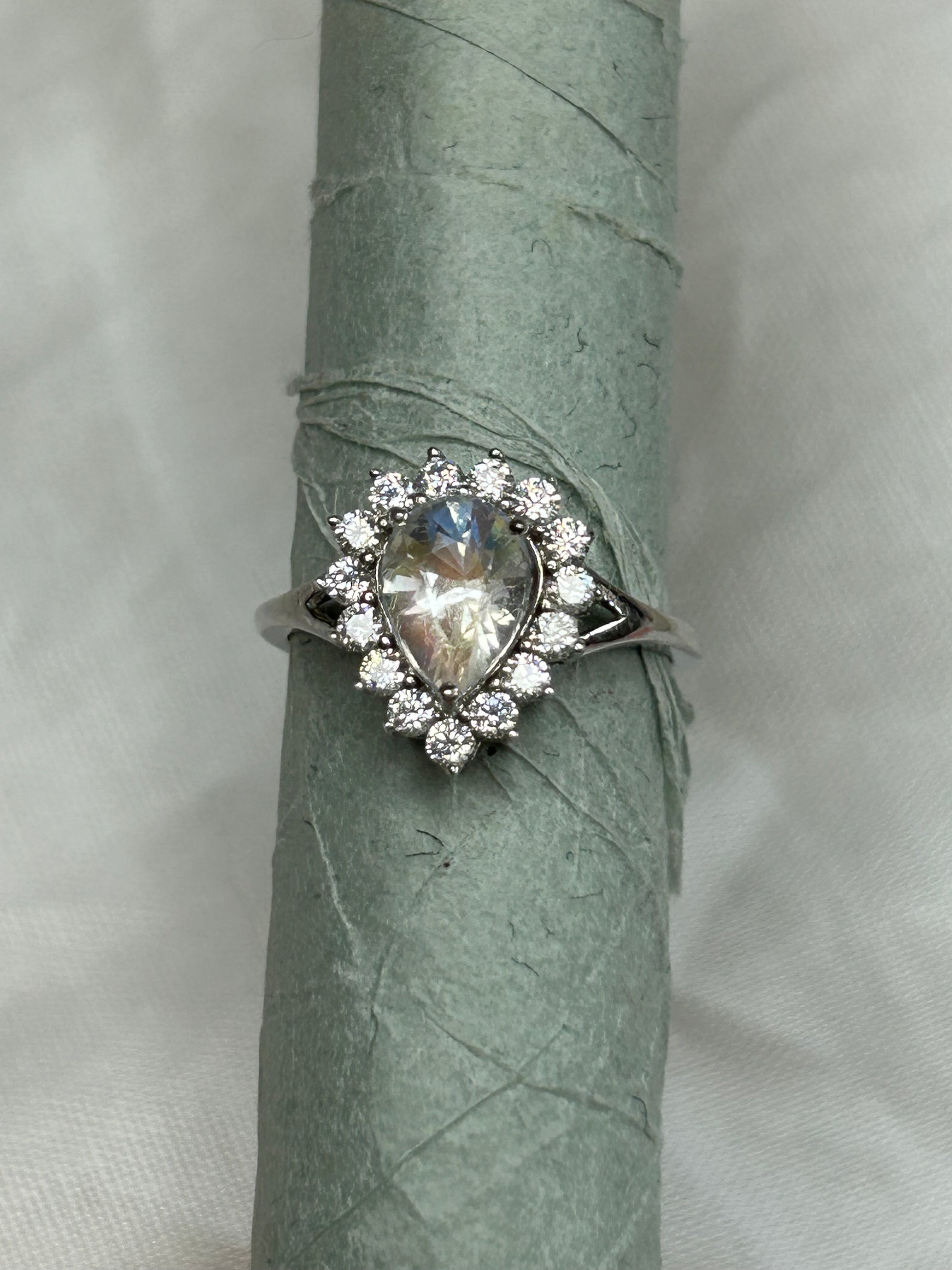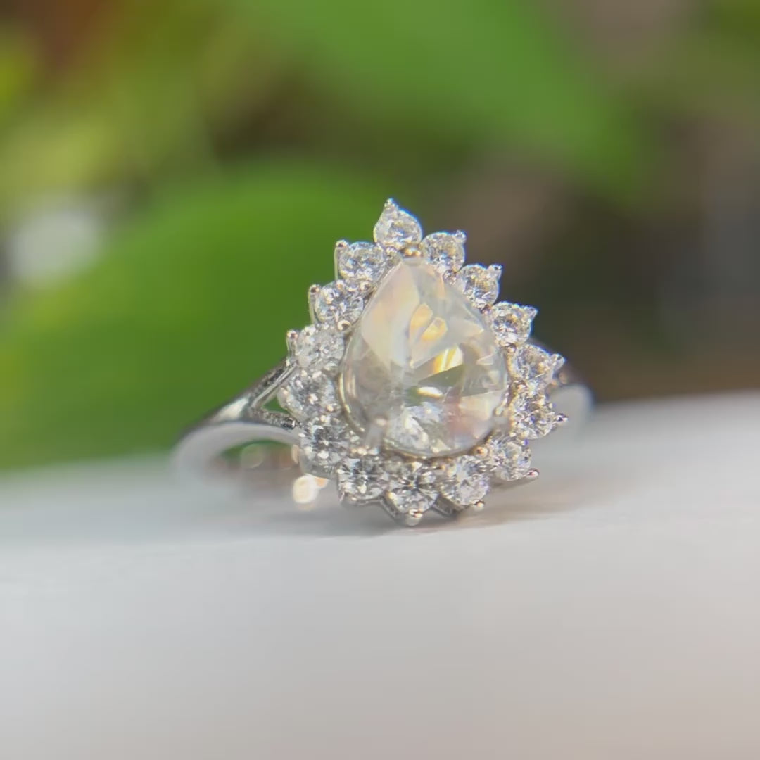This graceful ring features a 7×9mm natural moonstone in a delicate pear cut, known for its soft shimmer and dreamlike glow. Each stone catches the light with a unique play of iridescence, evoking the quiet magic of moonlight on water.