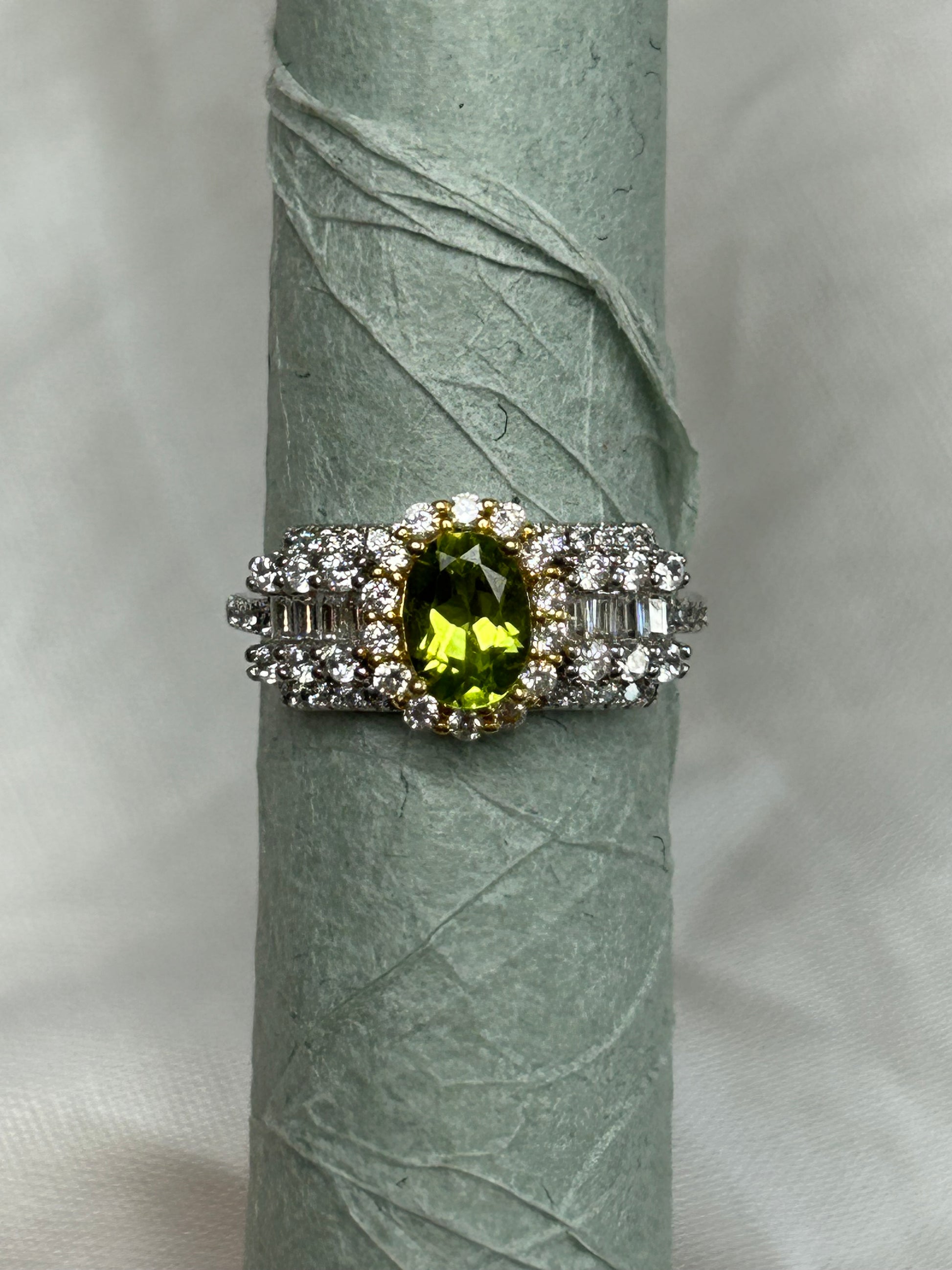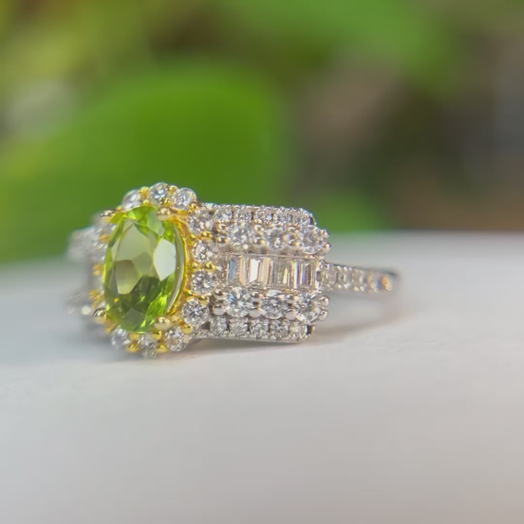 Bold in form, serene in spirit—Olive Crest features a 5x7mm natural peridot, its fresh green hue glowing like sunlight through leaves. Set against a broad, half-round band, the design strikes a refined balance between softness and structure.