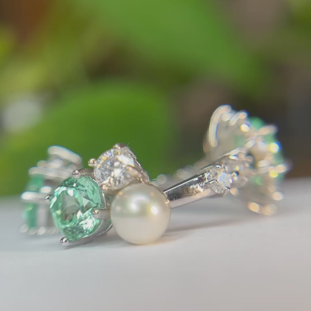 These luminous earrings feature 6×6mm natural freshwater pearls paired with lab-created Paraiba sapphires—known for their vivid tropical blue-green tone. Accented with sparkling moissanite stones, they offer a refined balance of softness and brilliance.