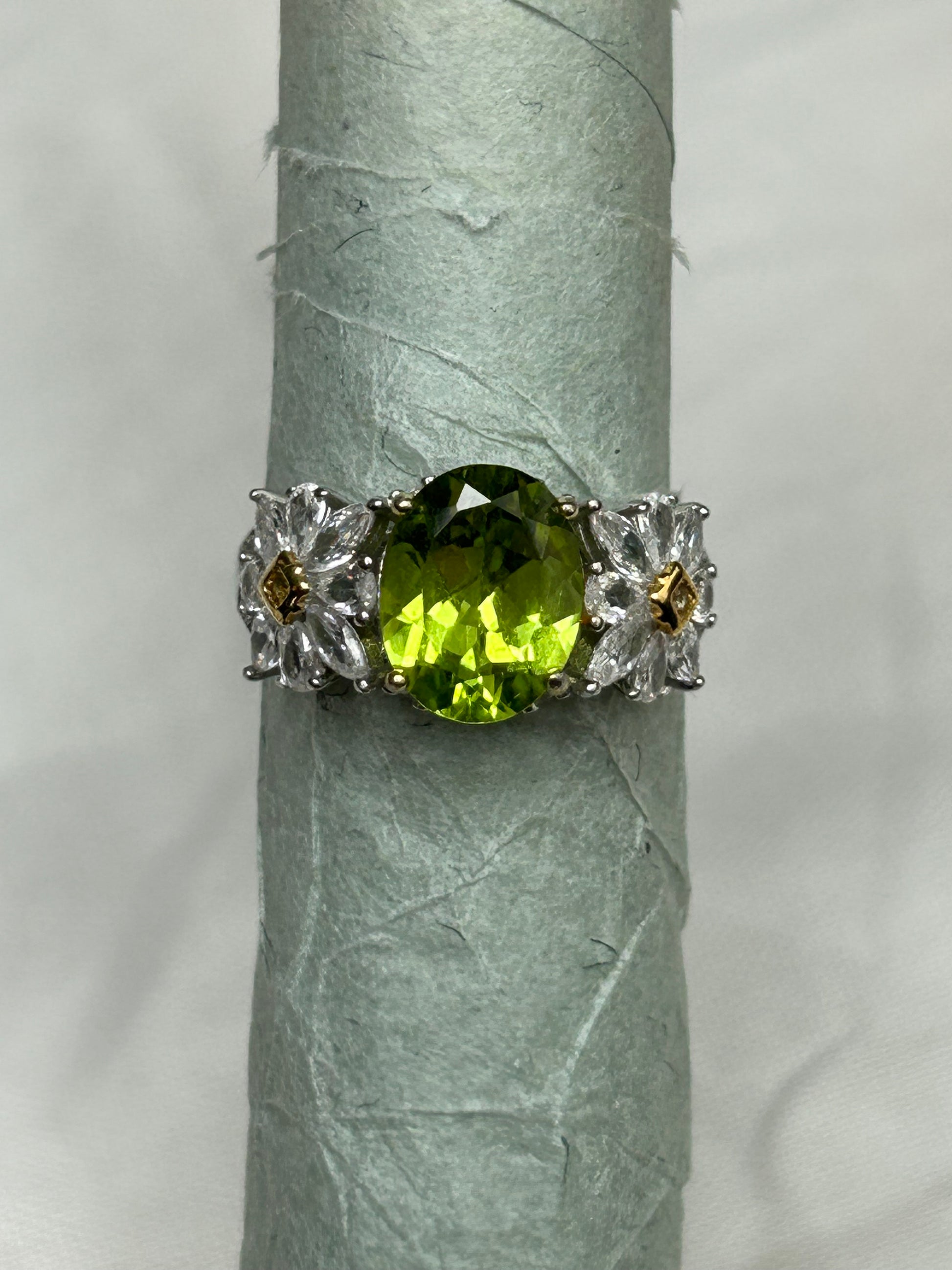 This graceful ring showcases an 8x10mm natural peridot—oval-cut to reveal its vivid green hue and fresh, light-catching brilliance. Flanking the center stone are two delicate floral accents, each set with sparkling cubic zirconia, adding a soft, romantic touch.