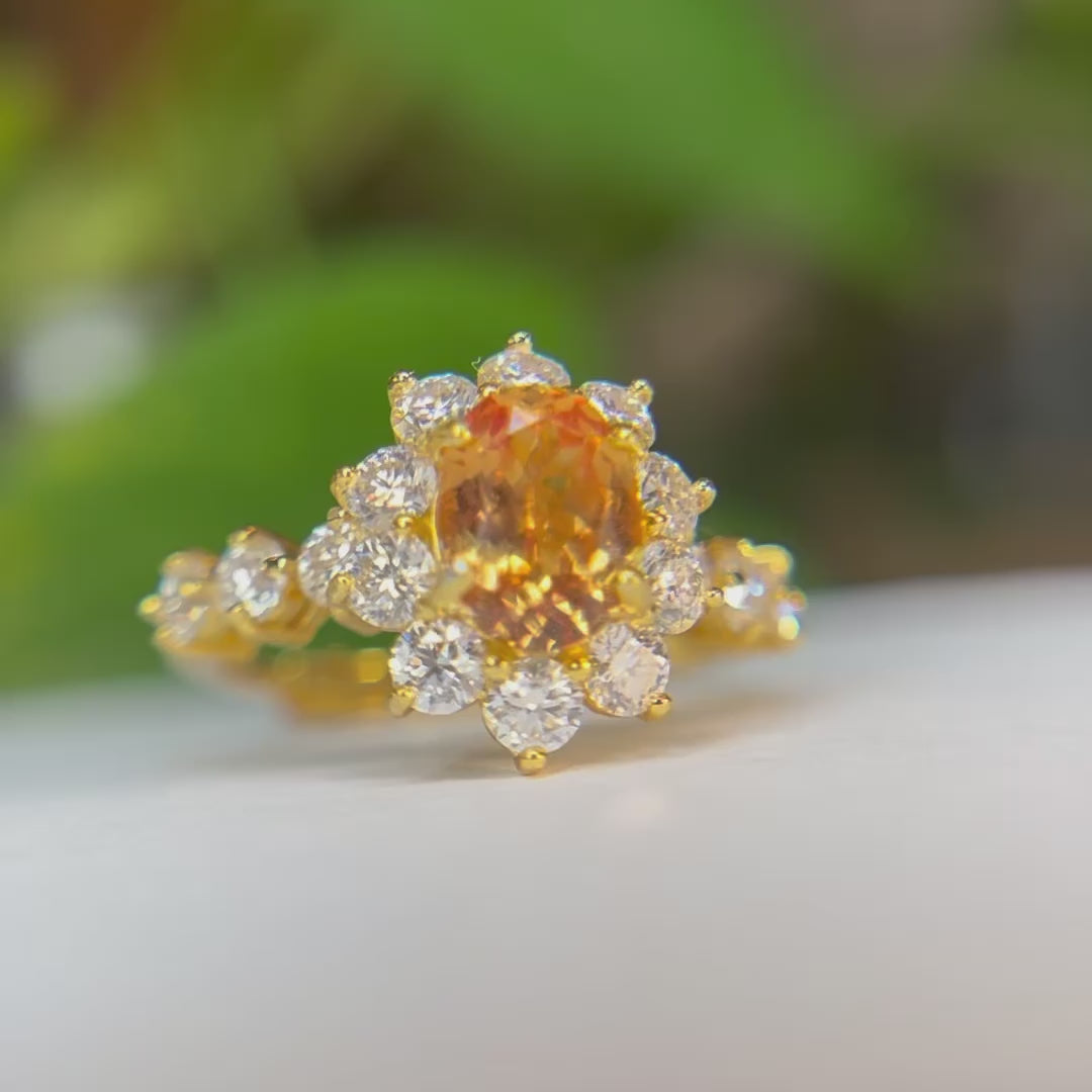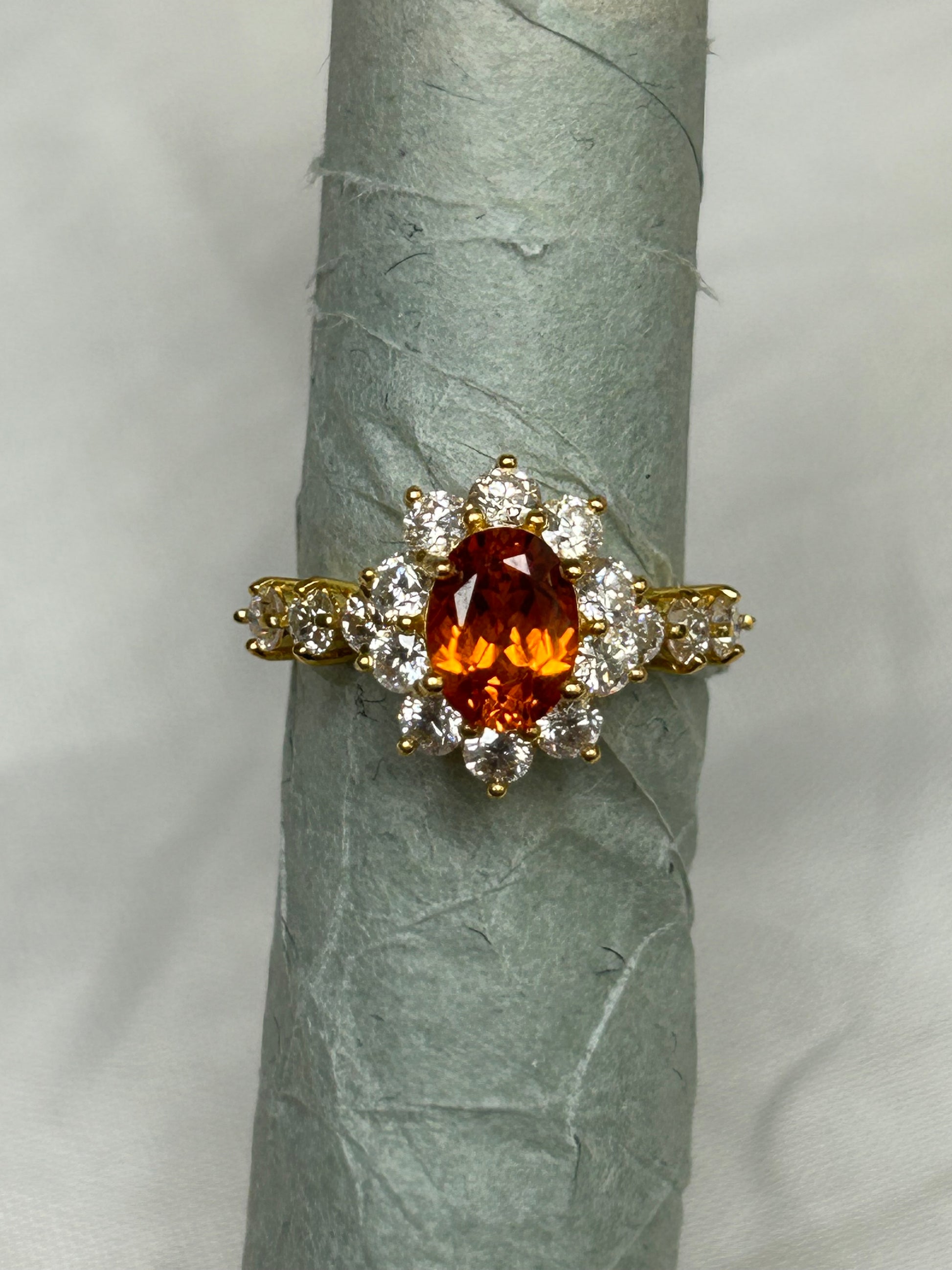 Regal yet radiant, this refined ring reimagines the iconic Princess Diana style with a modern, golden warmth. At its heart lies a 6x8mm lab-created orange sapphire—glowing with the rich, fiery tones of a sunset—set within a sunburst halo of brilliant moissanite.