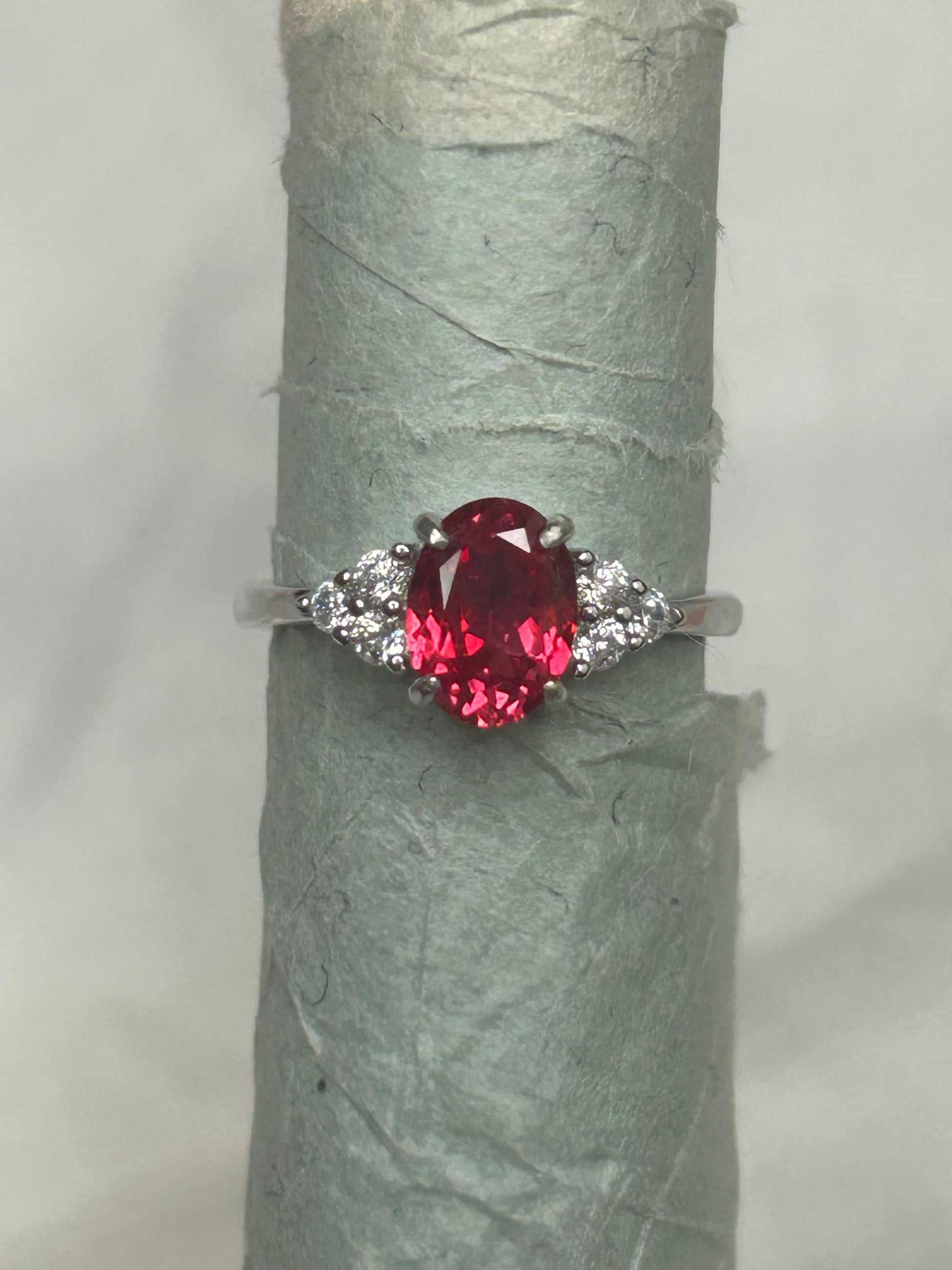 Elegant and timeless, this three-stone ring features a vivid 6x8mm lab-created ruby—deep crimson, full of passion and clarity. On each side, a trio of sparkling cubic zirconia stones adds brilliance and balance, creating a radiant harmony across the finger.